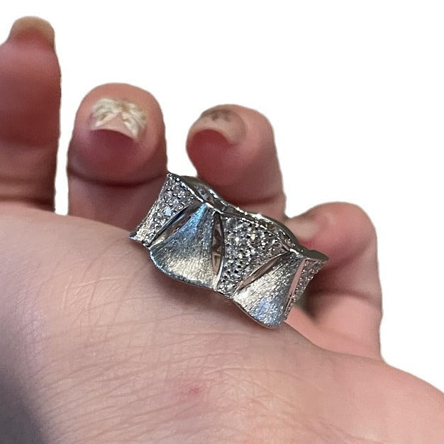 Clusters of brilliant, sparkling stones are artfully embedded along the raised waves, adding an extra touch of elegance and glamour. These stones (choose diamonds, cubic zirconia, or other gems based on your preference) reflect light beautifully, making this ring a perfect accessory for both day and night.