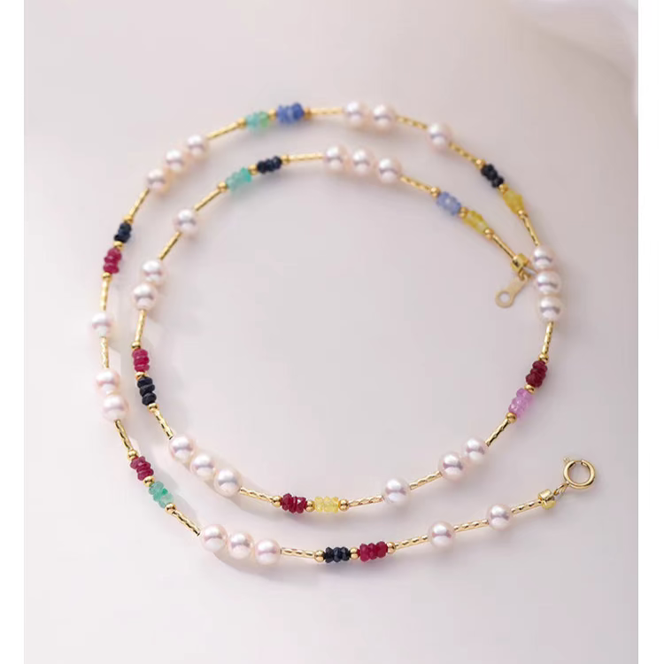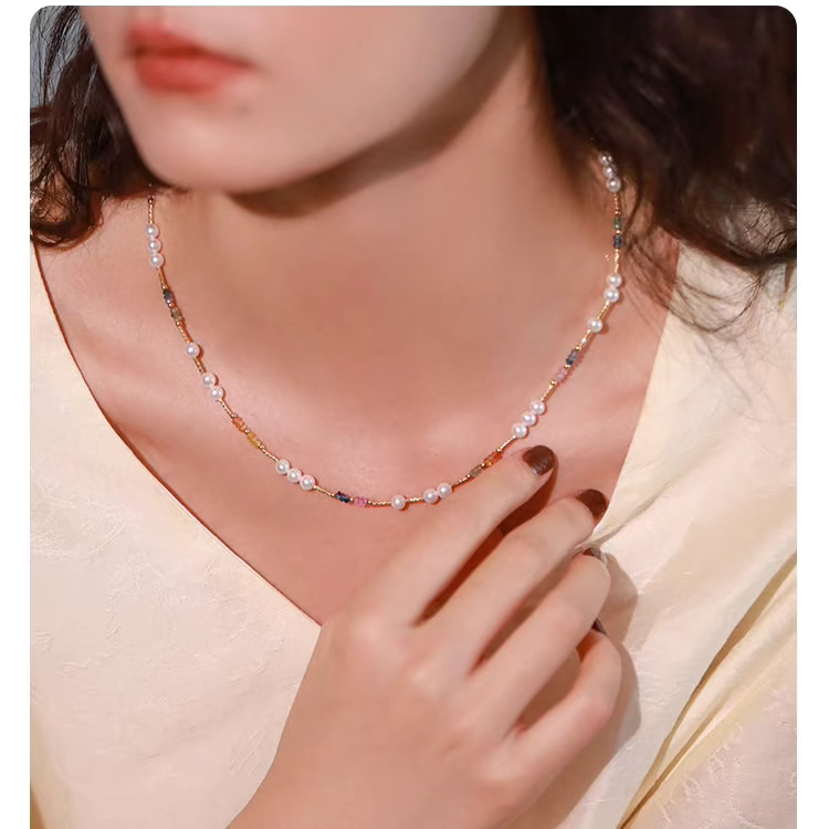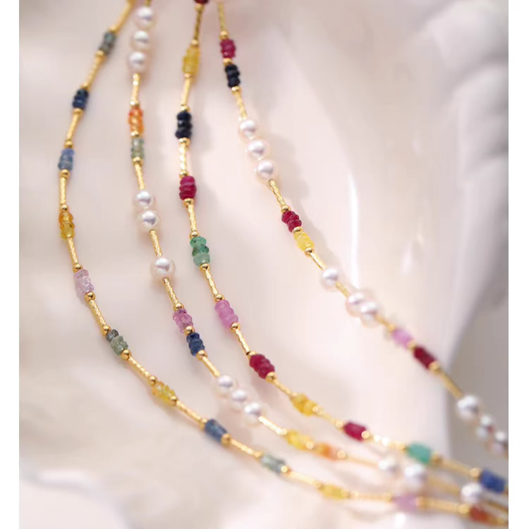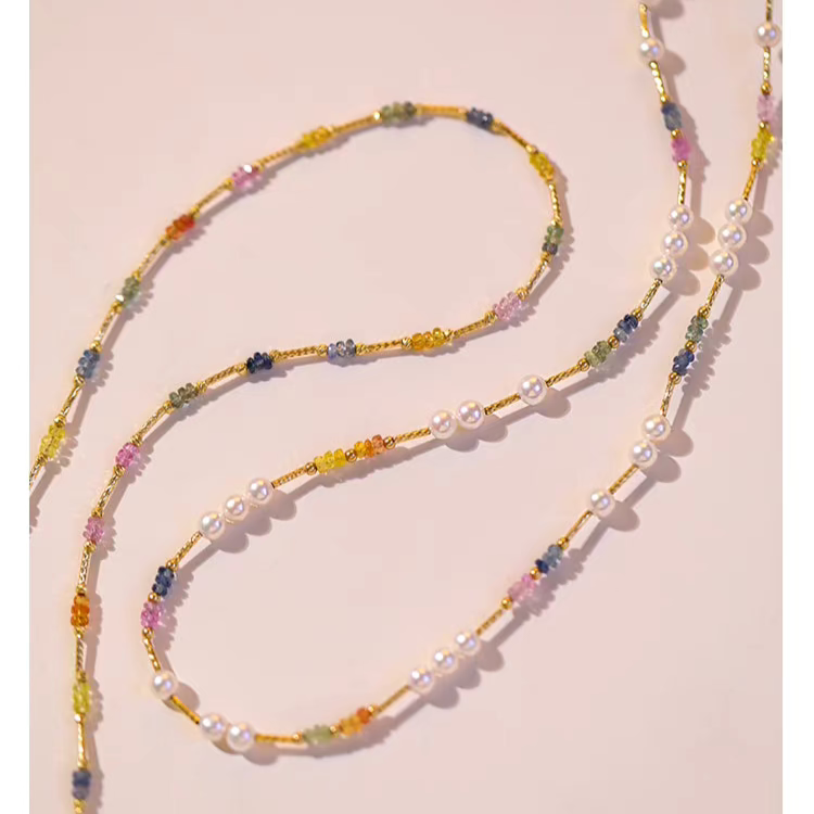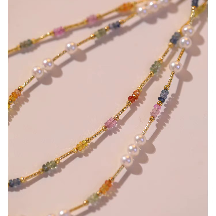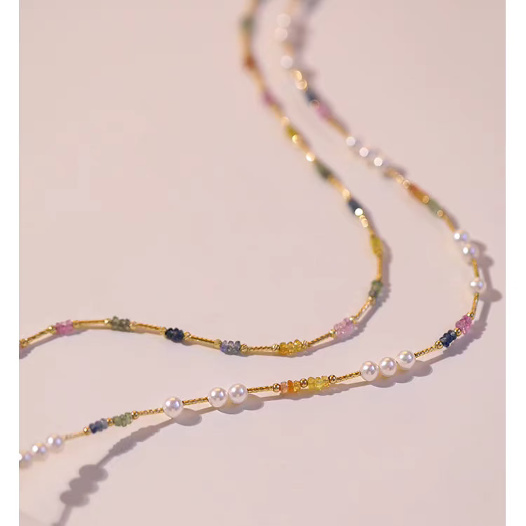 Natural Pearl & Colorful Sapphire Necklace – Summer Dopamine 18K Gold Beaded Collarbone Necklace