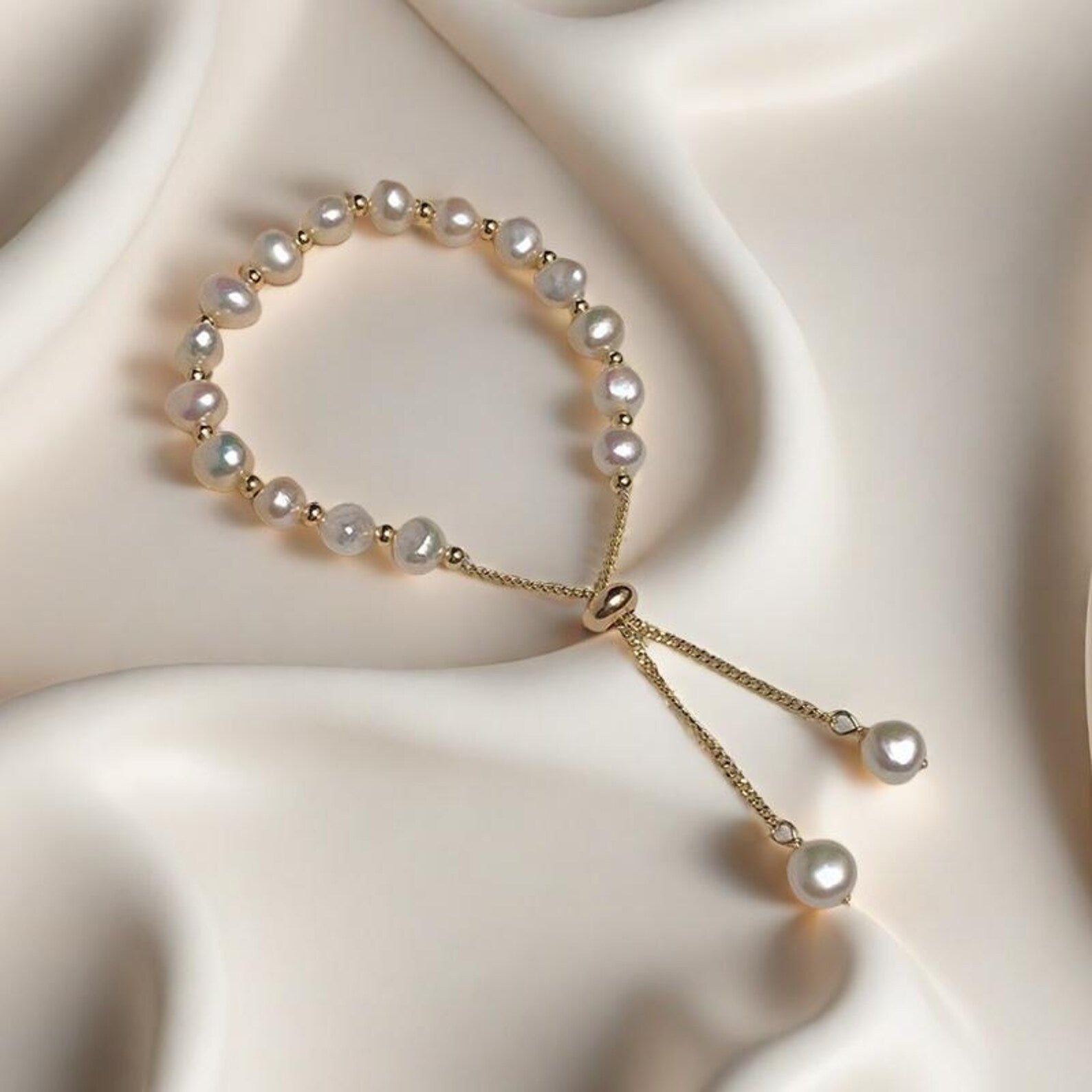 This stunning piece is handcrafted with care, using pearls imported directly from the renowned Freshwater farms of Zhejiang, China, and paired with 14K gold over S925 silver. The timeless beauty of these pearls, cultivated in the Pinctada fucata oyster, creates a bracelet that is both elegant and versatile.