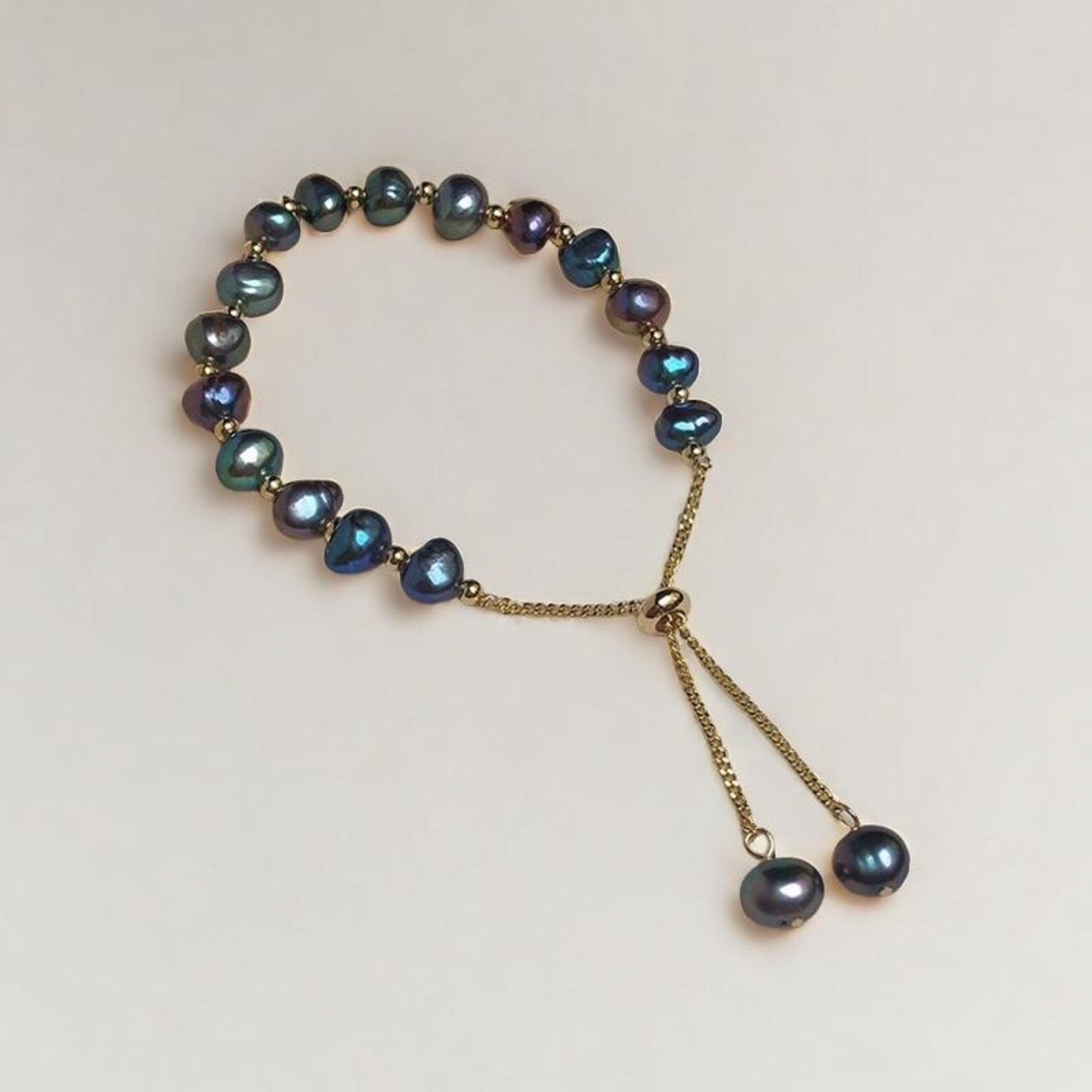 Peacock Blue-Green | Pink | White Baroque Pearl Bracelet with Adjustable Gold Chain, Elegant Freshwater Pearl Bracelet